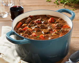 Tender beef simmered with carrots, pearl onions, mushrooms and bacon. Slow braised in a rich Burgundy red wine sauce.