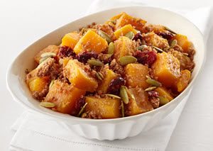 Tender butternut squash cooked in a brown sugar, vanilla and butter & topped with a pumpkin seed crumble. A perfect side with baked ham or turkey.